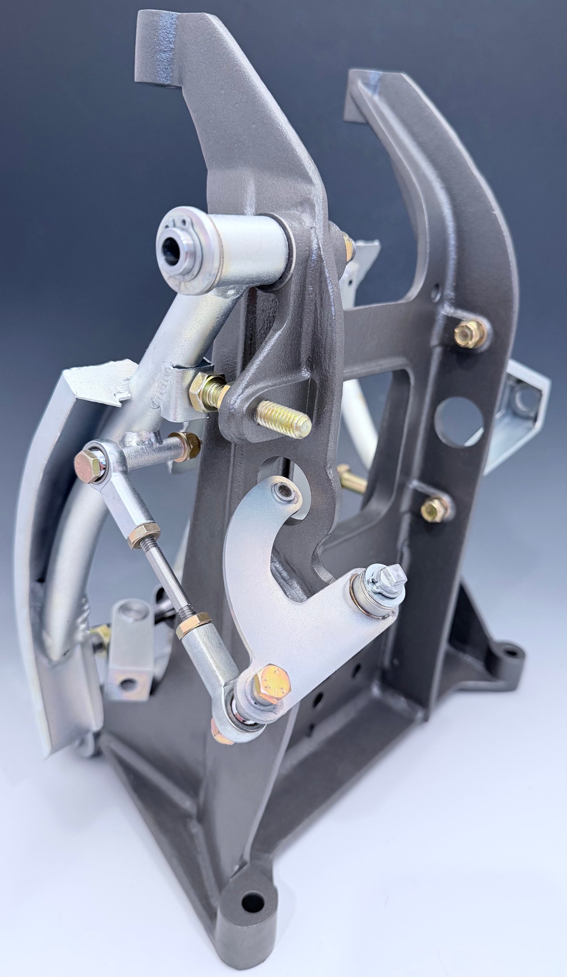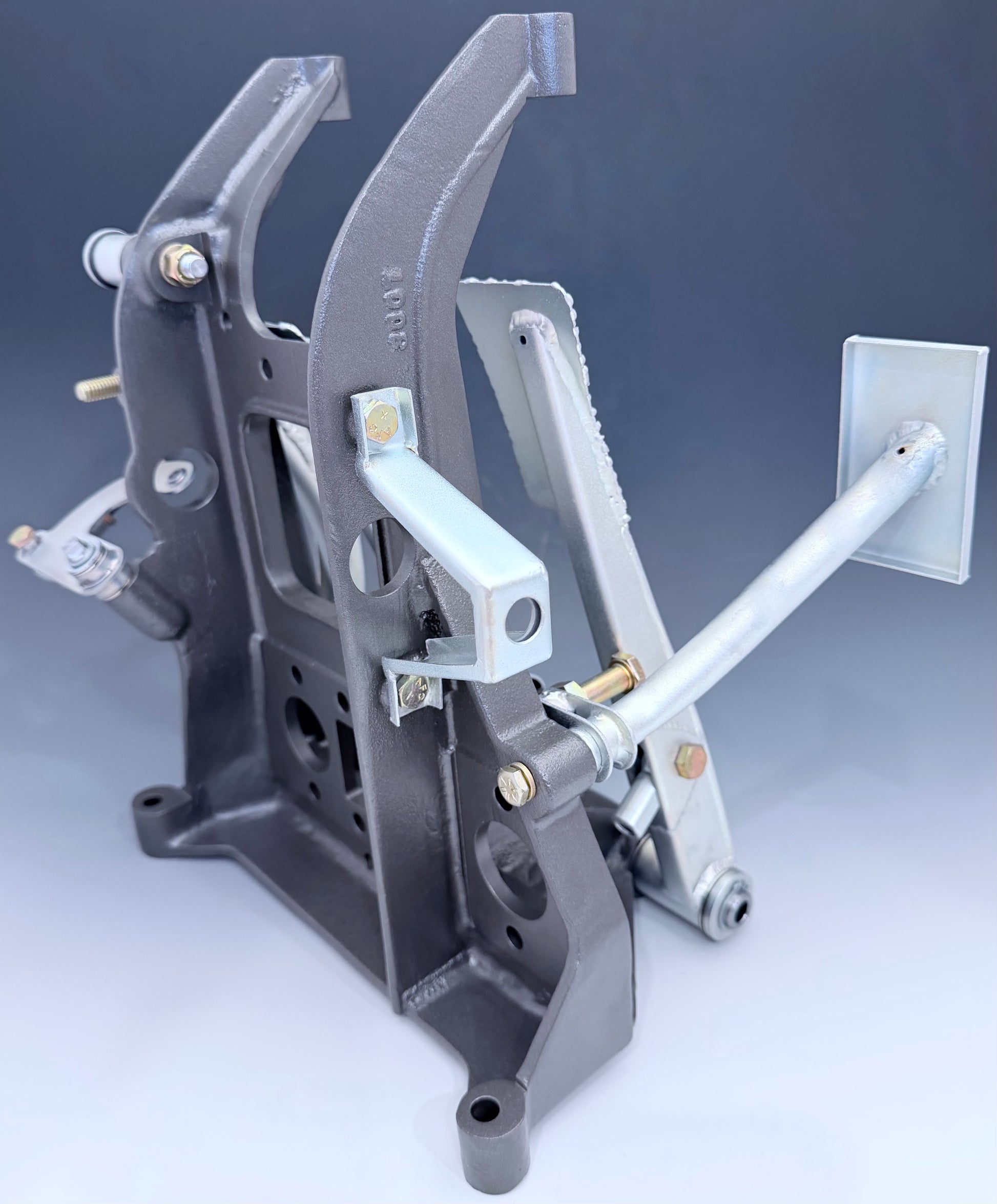 This version has the rectangular casting cutout behind the brake pedal that leaves more material in the casting near the master cylinders, making it more robust. This version (drawing revision E) of the casting was used on the MKI and MKII race cars that did not have the under-dash parking brake linkage.